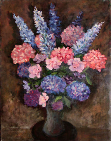 Stillleben mit Rittersporn und Hortensien 1982